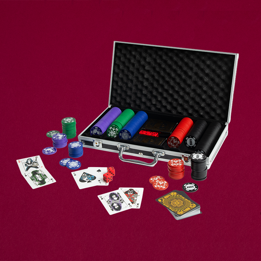Gather friends and loved ones around the table with the hottest band in the world! The new KISS themed Poker Chip Set features KISS playing cards, dice, chips and KISS poker set case.